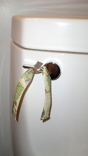 9. By now, you should be getting to the end of the roll. If you have some shelf liner left, and still can’t bring yourself to throw those silly scraps away, try tying a fun little bow onto the toilet flush handle. This is great for the potty-in-training kiddies who can’t reach that high.
