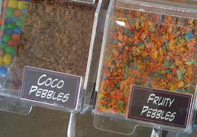 …where you grab your own size cup, be it Piggy, Extra Piggy, or the Super Oinker. Then you pick a flavor of yogurt and yank down the dispenser that poops out chocolate or vanilla and because you are five years old, you either giggle with your cohorts, or you stave off that gag reflex and remember the time when you were a kid and your cat left a stinky pile on your bedroom carpet because little Fluffy didn’t approve of the lackadaisical litter box cleaning schedule.
