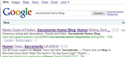 First of all, I would like to thank Google who has decided that Nanny Goats in Panties should be the #1 (NUMBER ONE!!!) search result for "Sacramento Humor Blog". Woo Hoo! I should also note that it is the #1 result when you enter Nanny Goats in Panties, or does that go without saying? I always forget whether or not I should point out the obvious.