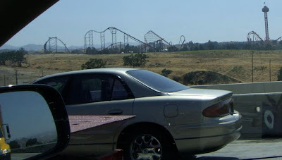 Not the grey car, silly. Magic Mountain. Geez, do I have to spell everything out for you? By now it's just a hop through Valencia, a skip across the Valley, and a jump past the Getty Museum into the Westside.
