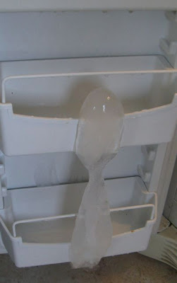 I can only guess that some elf got locked in there while I was gone and created an ice sculpture while waiting for my return to let him out. Either that, or the fridge is on the fritz. {SIGH} I noticed the door shelf (the one right underneath the ice dispenser) was filled with water.