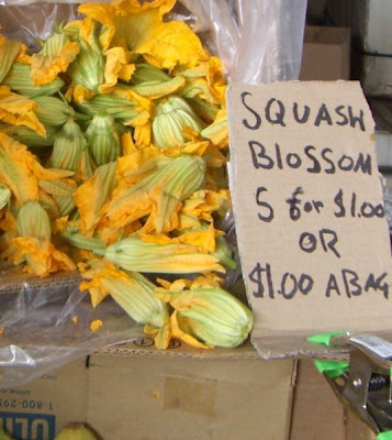 I stood there like a tourist and took a picture of these squash blossoms, attempting nonchalance, because what idiot takes pictures of vegetables at the Farmer’s Market? I mean, really. I’ve never seen anyone take a picture there. People are too busy pushing and shoving to get to the perfect basket of strawberries, ignoring the fact that this is a civilized society, people and there’s a line here, buddy, I want to pay for my avocados too you know and I got here before you! That is what normally happens at these places. Anybody stopping to snap a photo is just plain cuckoo and should be made fun of.