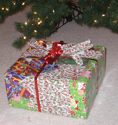 I scrounged around the house, per the internet’s instructions, and wrapped my white elephant gift thusly: