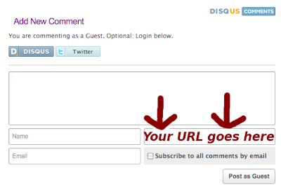 If you are just leaving a comment as a “Guest” with no registered Disqus profile, and you want your URL to appear in your comment (so that I can visit your blog), make sure to fill out the “Website (optional)” portion of the comment form.