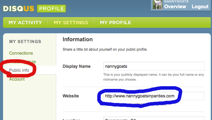 If you do have a Disqus Profile, go to it by clicking on your username after leaving a comment here. Click on My Settings, then click on Public Info. Add your blog URL to the section entitled: “Website”.