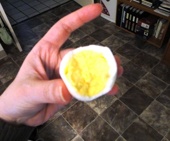 I put a hardboiled egg into our fridge the other day for safekeeping. It rubbed up against an old bottle of soy sauce, cracked, and the yolk shriveled up completely. Which was bizarre and unexpected. And a sad commentary on my mental state that I was fascinated by such a thing.