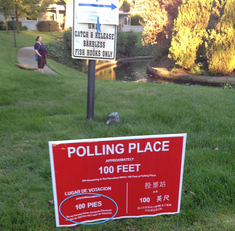 Don’t ever eat the squirrel pot pie unless you know who cleaned the squirrels. If they don’t take the hair off the squirrels. you can have a real mess on your hands… and in your teeth. The Polling Place sign has different languages on it. Is that Chinese or Japanese? The other sign warns you that you must fish with a barbless hook and release your catch. There is a duck in the water mooning you! There is just too much confusion for you to comprehend before you ever get inside. When we vote, we are given a plastic card the size of a credit card. It slips into a slot in the machine and we vote on a touch screen. You should go back to voting on an absentee ballot. This was not good for you. No wonder you got the “I Voted” sticker in the wrong place. It goes across the bridge of your nose. It makes the breathing easier and the air fresher for you because you voted.