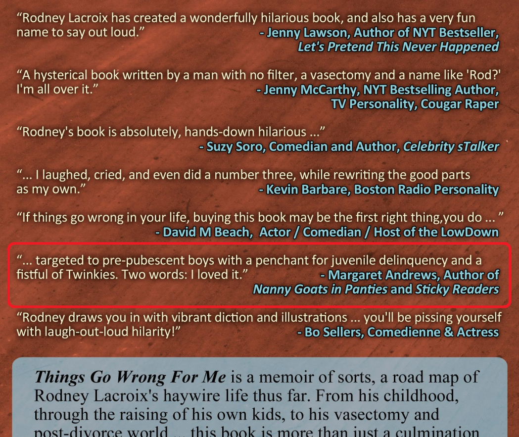 Also? I don’t mean to brag (yes I do), but my back cover blurb on his new book, Things Go Wrong for Me, joins other blurbs from such luminaries as Jennifer Lawson (The Bloggess), Jenny McCarthy, and Suzy Soro (Hollywood, Where Hot Comes to Die).