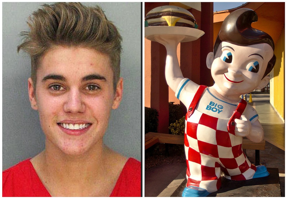 Yes, he does, although Bob’s Big Boy might not appreciate the comparison. I find Bieb’s imperfect complexion sweet, humanizing. But what the hell is he smiling about? Does he think getting busted makes him gangsta? Doesn’t his Audi R8 with the leopard paint job definitively preclude that?