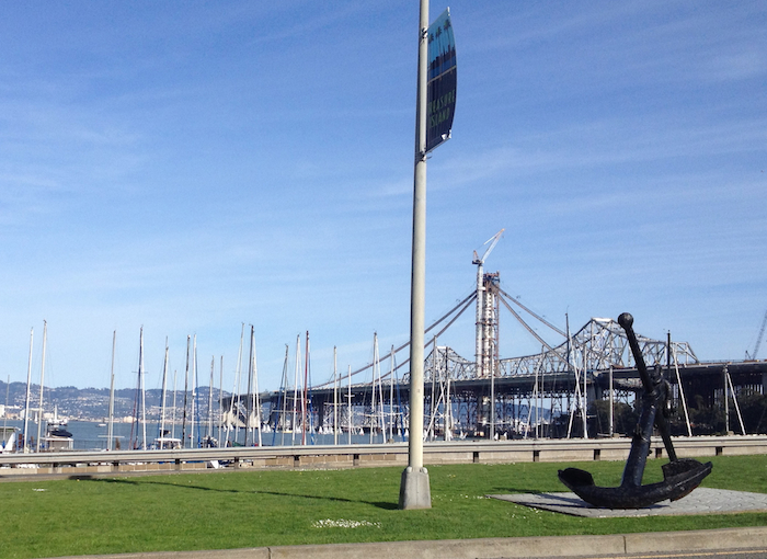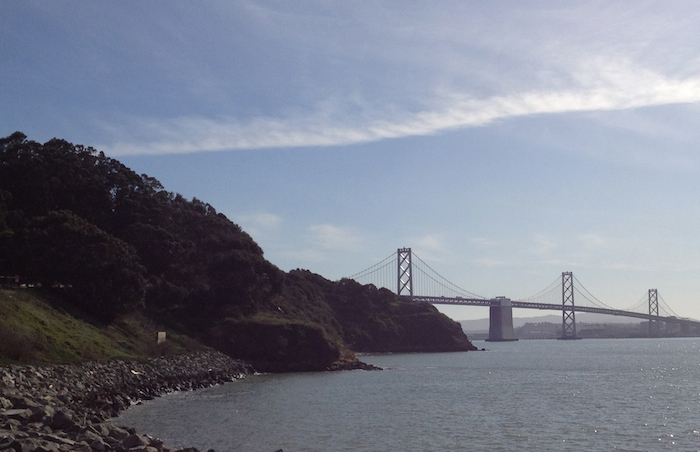 He did say that I could get off at Treasure Island, a spot of now touristy land halfway across the bridge, and turn around there.