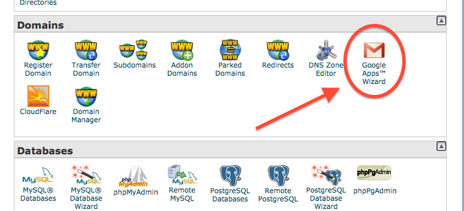 UPDATE: Adam of Think Plan Run, pointed out a new feature on Bluehost that eases this process of handling Google Apps email. Instead of manually adding MX entries from teh Bluehost cPanel, you go through the Google Apps wizard on your Bluehost cPanel (which you’ll find in the Domains section).