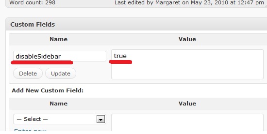 While this change seems simpler, it isn’t advisable, particularly if you anticipate having to disable the sidebar for more than one page because you will have to go into the page.php file over and over again, thereby increasing your risk of destabilizing your theme. Speaking as a former computer programmer, it is always better to create custom fields or variables that can be easily changed as opposed to “hard coding” numbers into a program.